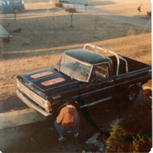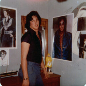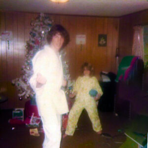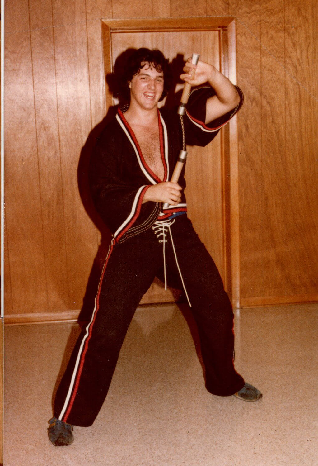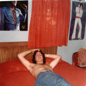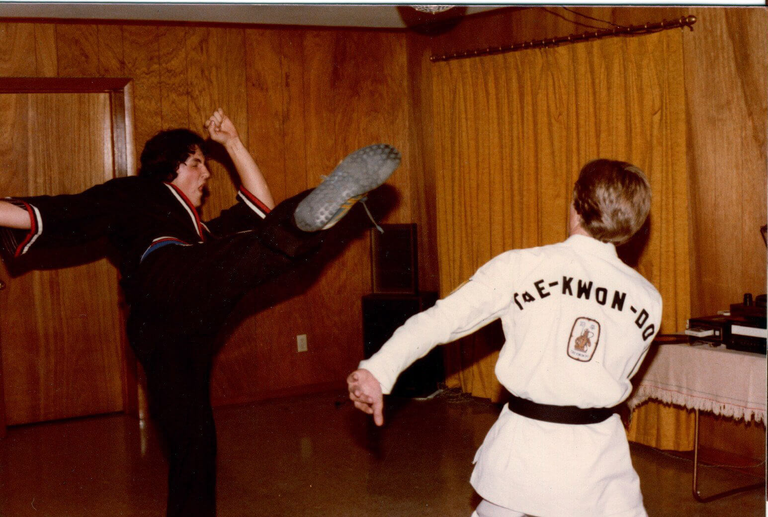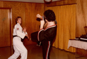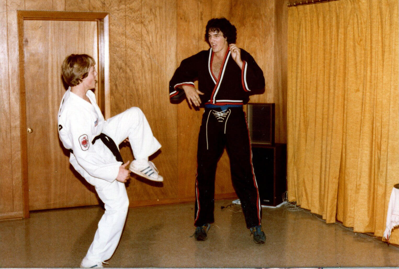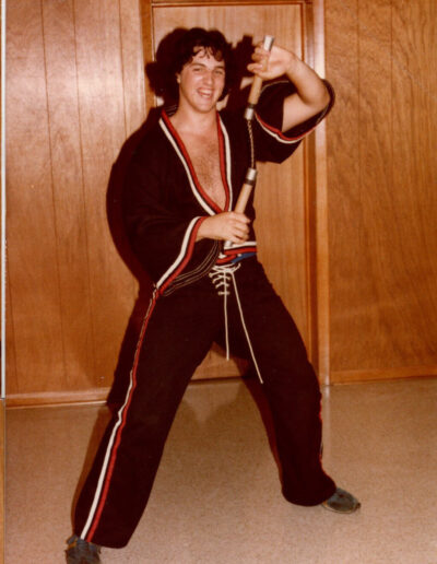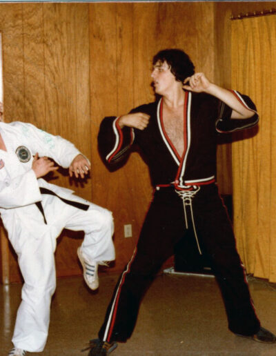 Elvis James developed a deep commitment to martial arts, devoting years to the study of karate and taekwondo and ultimately earning his black belt. His training became an important part of his life, both for discipline and personal fulfillment. In these photos, he and a close friend share a lighthearted sparring session, with the friend wearing Elvis James’s white gear while Elvis James appears in one of his specialty sets, the style made famous by Superfoot Wallace in the film A Force of One.