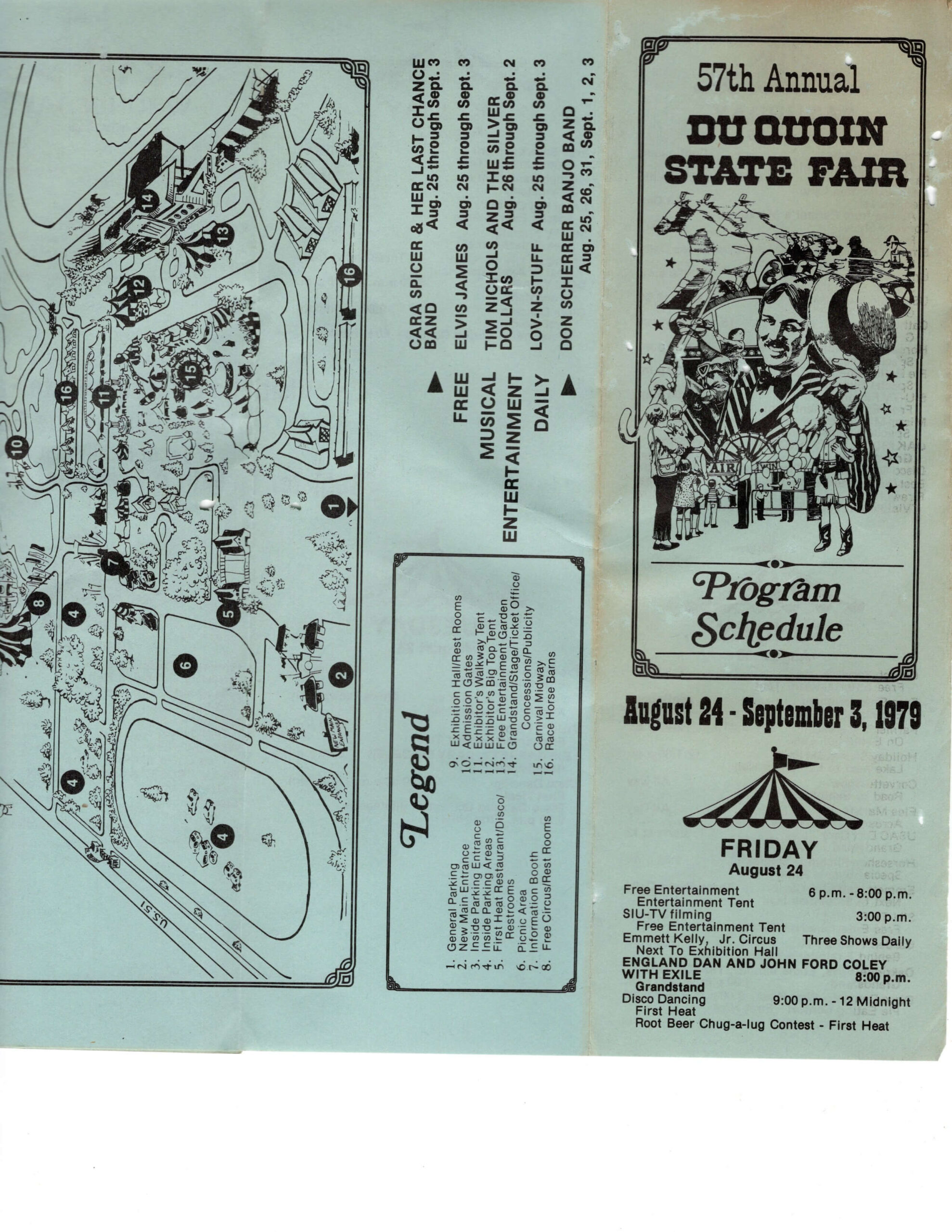 Fair programs and newspaper features from multiple seasons highlight Elvis James as a returning favorite whose look, sound, and stage manner captured the excitement of fairgoers year after year. Visitors could find him performing hourly shows south of the grandstand or appearing on the free entertainment stage, often sharing the lineup with groups such as Lov-n-Stuf, Ken Carlysle and the Cowboys, the Don Scherrer Banjo Band, and a variety of specialty acts.