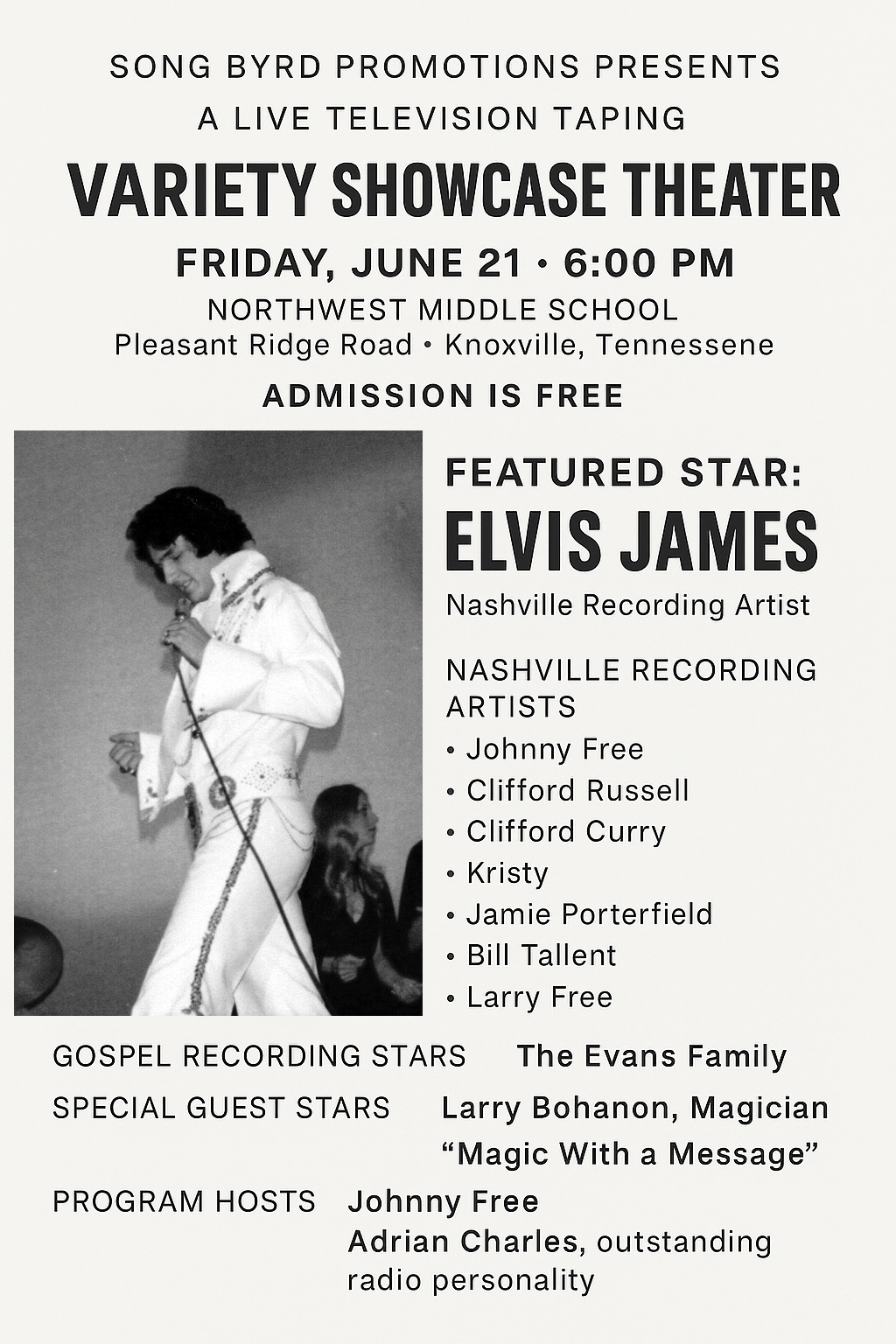 In June of that year, Song Byrd Promotions presented a live television taping of the Variety Showcase Theater at Northwest Middle School in Knoxville, Tennessee. The program brought together Nashville recording artists, gospel performers, dancers, and specialty acts for a free community event that captured the spirit of local entertainment at its finest. Among the featured entertainers was Elvis James, whose performance added a dynamic presence to the lineup.